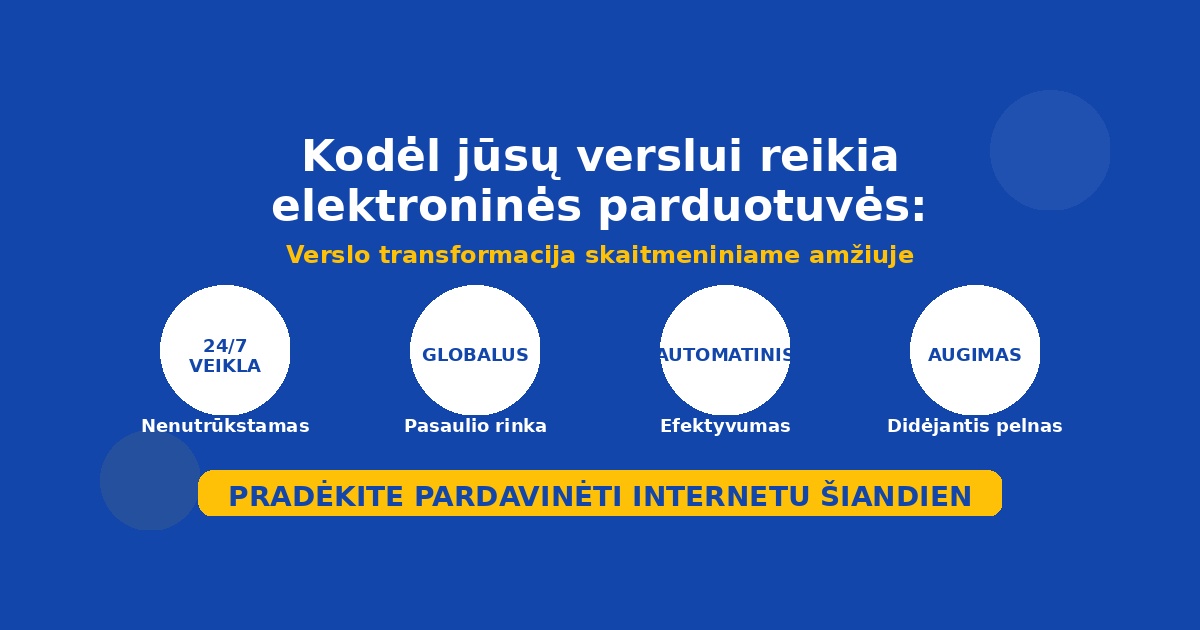 Klausimas jau seniai nėra "ar reikia elektroninės parduotuvės", bet "kada ją sukurti ir kaip maksimizuoti jos efektyvumą". Verslas be skaitmeninio kanalo šiandien ne tik praranda galimybes augti, bet ir rizikuoja atsilikti nuo konkurentų.